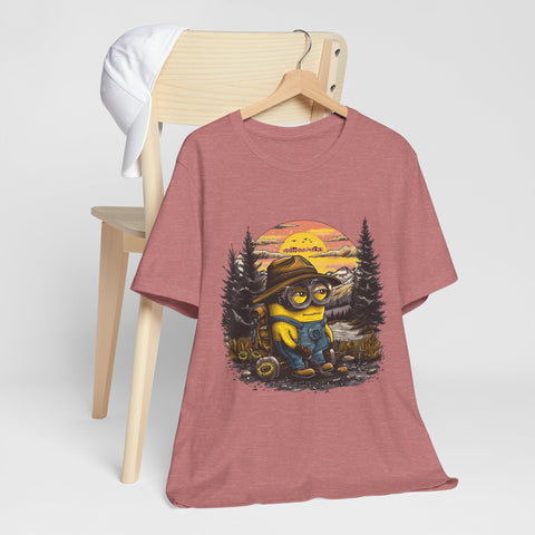 A fun and quirky Minion hiking Tee for mushroom hunters. This tee exudes a playful and adventurous vibe, perfect for outdoor enthusiasts and fans of the Minions franchise. It can be worn casually or on hiking trips, making it a versatile addition to any wardrobe. Ideal for gifting on birthdays, holidays, or special occasions.